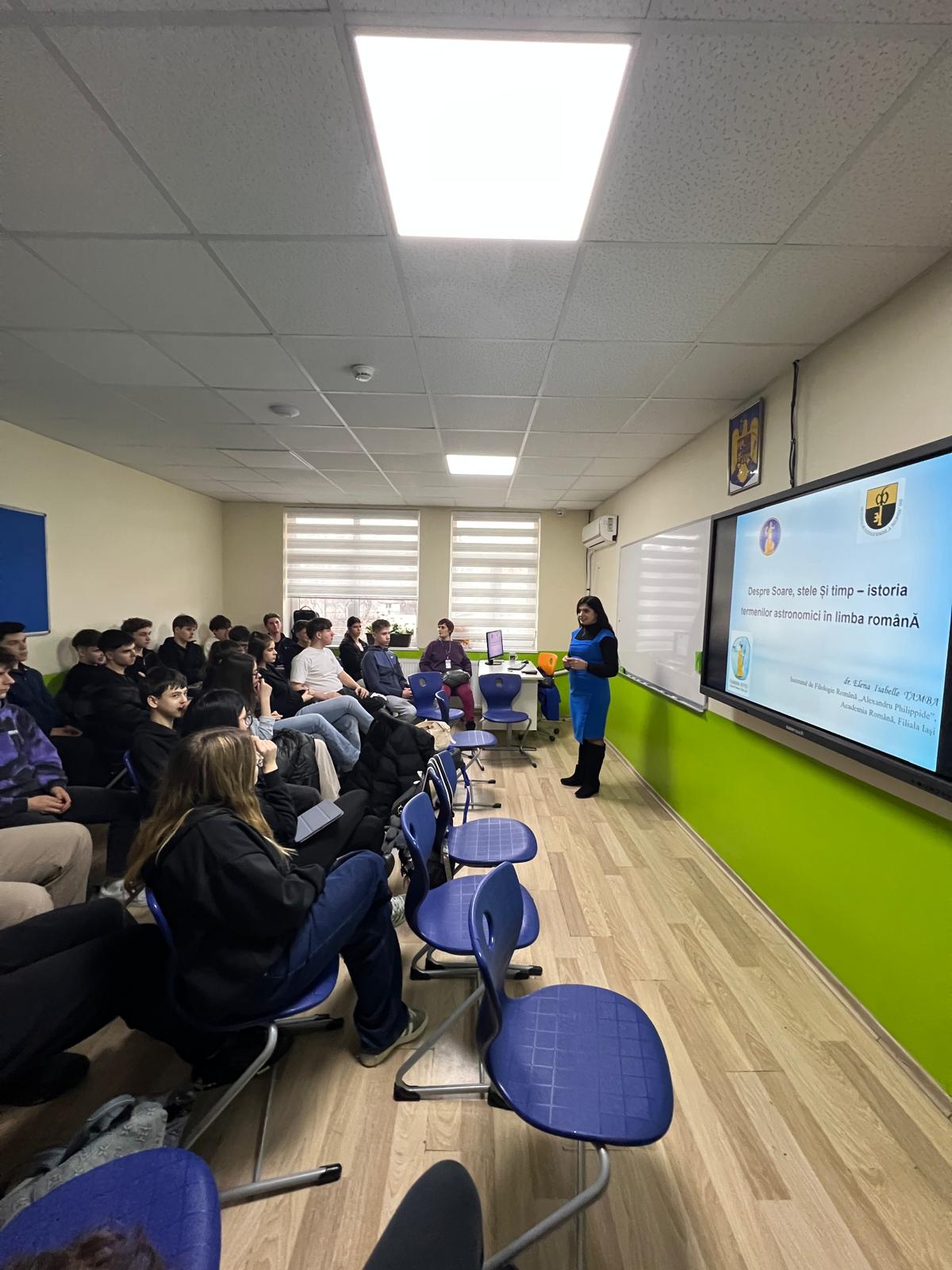 Dr. Elena Isabelle Tamba de la Institutul de Filologie Română „Alexandru Philippide” a moderat un dialog cu elevi din clase de gimnaziu și liceu și cu profesorii lor de la Liceul Teoretic Internațional „Spectrum” din Iași, despre cuvinte și expresii legate de Soare, timp, anotimp, stele și constelații în limba română de la începuturi și până în prezent.