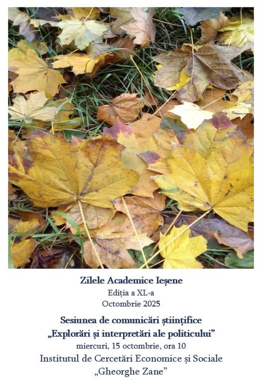În cadrul Zilelor Academice Ieșene, miercuri, 15 octombrie, ora 10, la Institutul de Cercetări Economice și Sociale „Gheorghe Zane” va avea loc Sesiunea de comunicări științifice „Explorări și interpretări ale politicului”. Vor fi prezentate următoarele comunicări: CS I Cătălina Răducu, Institutul de Cercetări Economice și Sociale „Gheorghe Zane”, „Dilema de gen a securității: de la […]