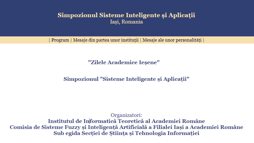 Simpozionul "Sisteme Inteligente şi Aplicaţii" 17 octombrie 2025, ora 9 On-site și On-line Organizatori: Institutul de Informatică Teoretică al Academiei Române Filiala Iași Comisia de Sisteme Fuzzy şi Inteligenţă Artificială a Filialei Iaşi a Academiei Române Sub egida Secției de Ştiinţa şi Tehnologia Informaţiei Bogdan AMAN – Behavioral Equivalence in Reactive Systems Andrei ALEXANDRU, […]