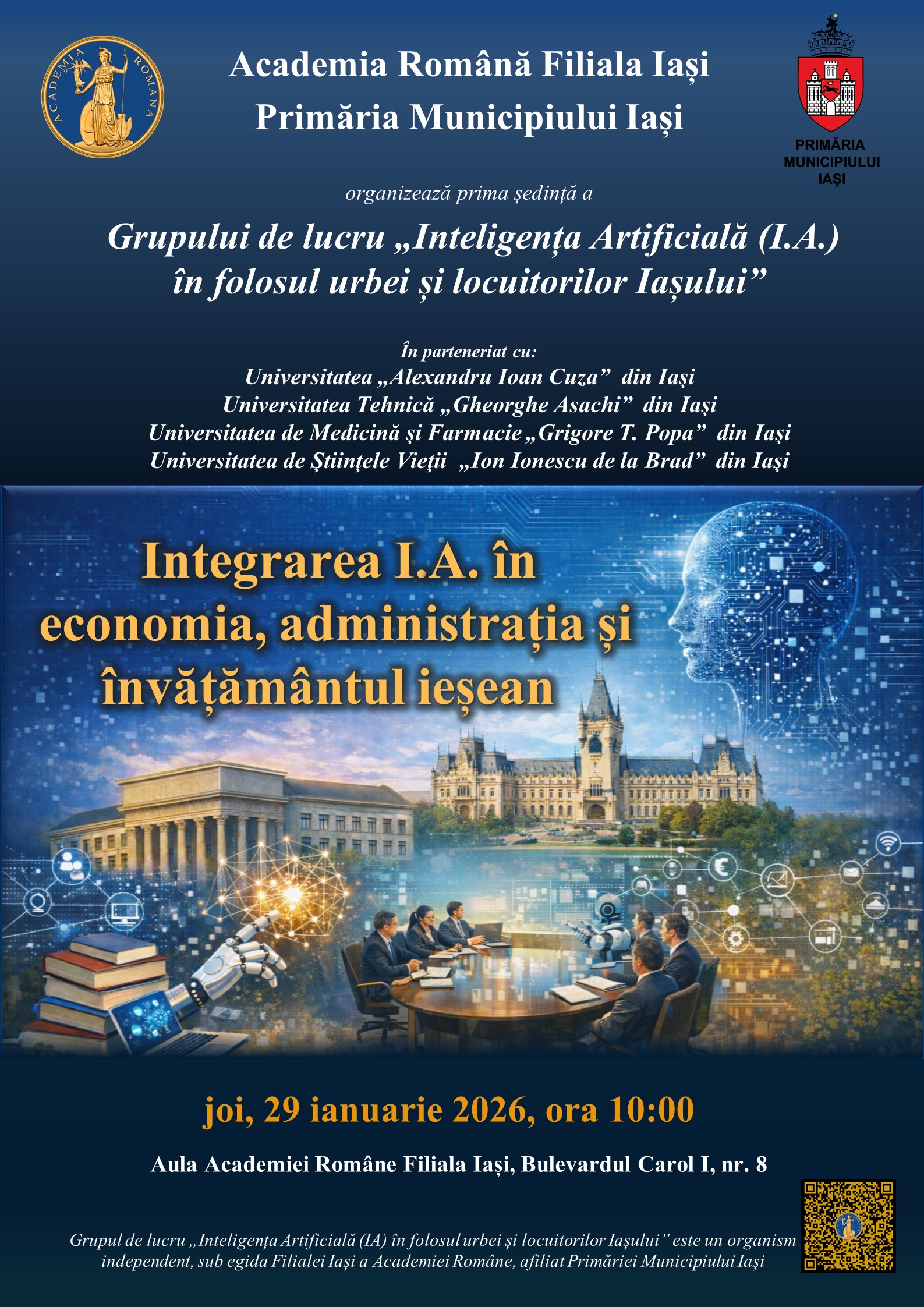 Integrarea IA în economia, administrația și învățământul ieșean, va avea loc joi, 29 ianuarie 2026, ora 10:00, în Aula Filialei Iaşi a Academiei Române.