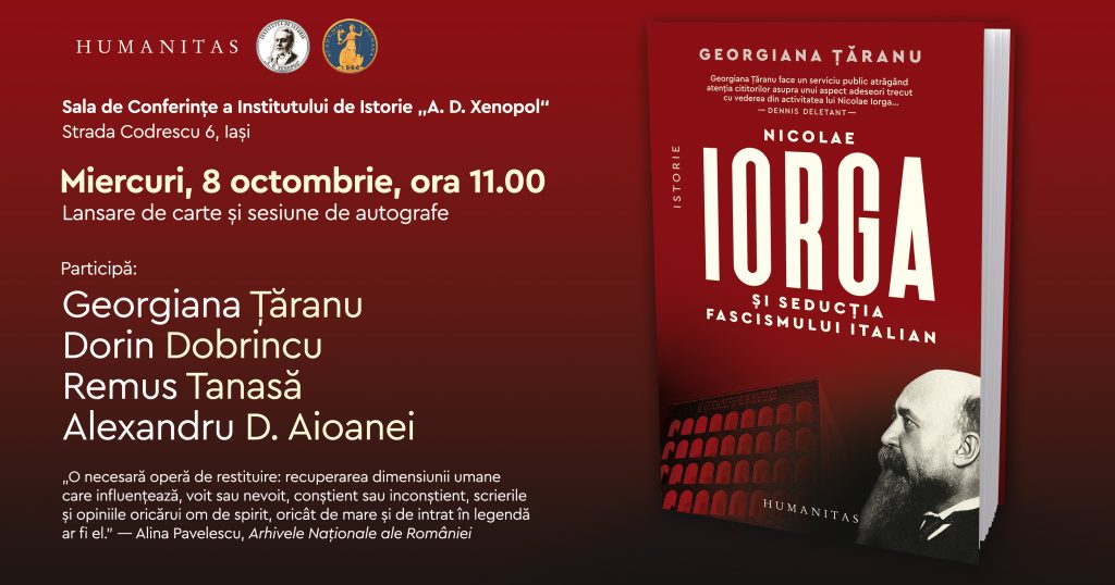 Institutul de Istorie „A. D. Xenopol” și Editura Humanitas organizează lansarea volumului Georgiana Țăranu, Nicolae Iorga și seducția fascismului italian, Humanitas, 2025.