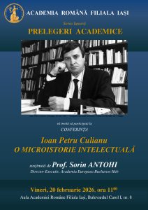 Academia Română – Filiala Iași organizează seria lunară de conferinţe sub genericul „PRELEGERI ACADEMICE” și vă invită să participați la conferința Ioan Petru Culianu. O microistorie intelectuală susținută de Prof.