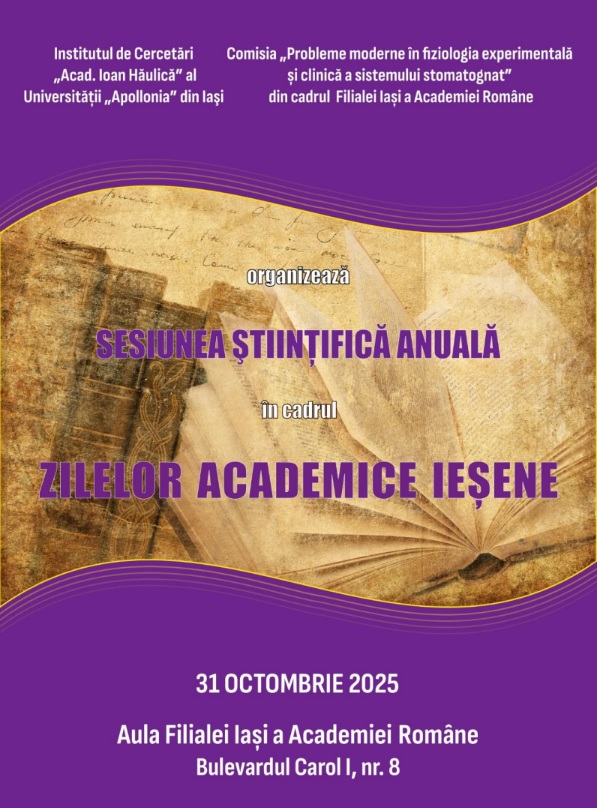 Comitetul de organizare este onorat să vă invite să luați parte la Sesiunea Ştiinţifică Anuală a Institutului de Cercetări „Acad. Ioan Hăulică” al Universității „Apollonia” din Iaşi împreună cu Comisia „Probleme moderne în fiziologia experimentală și clinică a sistemului stomatognat” din cadrul Filialei Iași a Academiei Române.