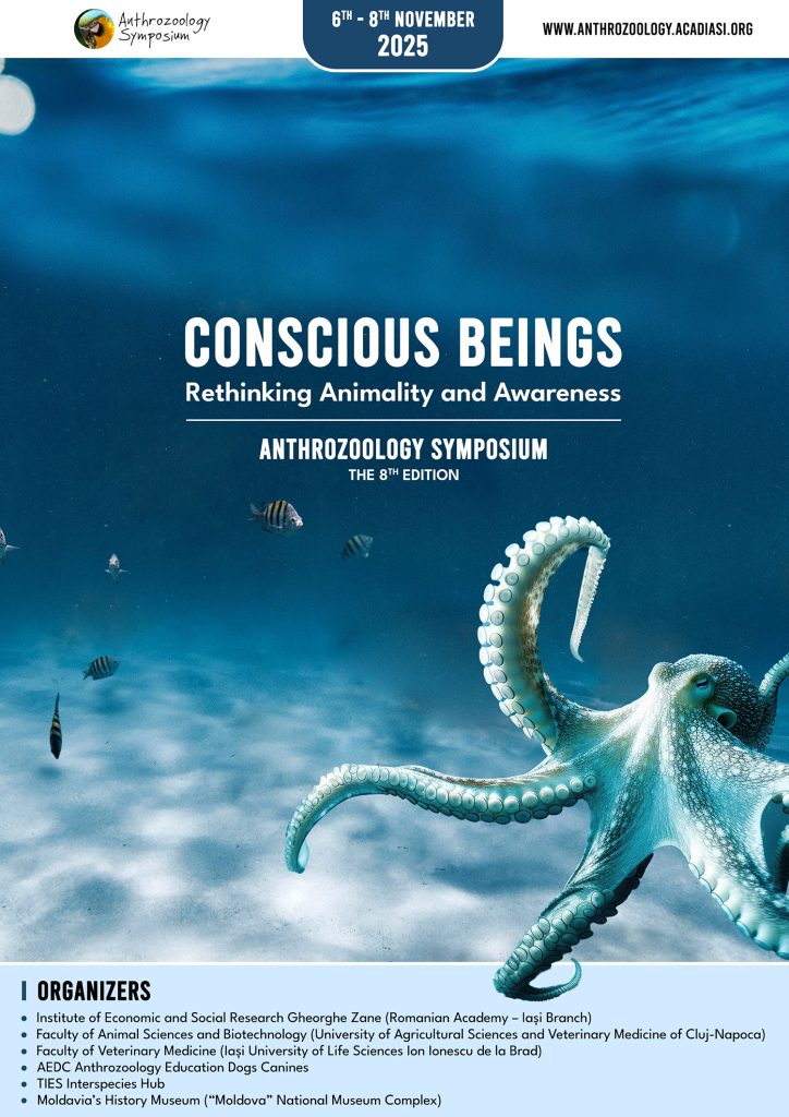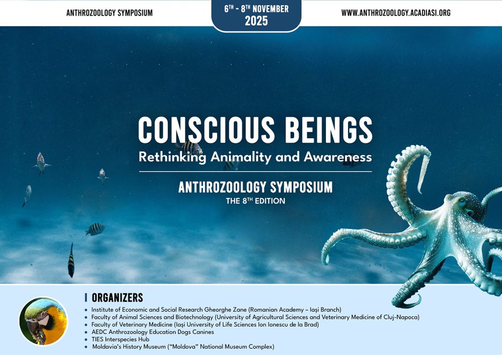 Vă invităm la ediția a opta a simpozionului internațional Anthrozoology Symposium, Conscious Beings: Rethinking Animality and Awareness organizat în perioada 6 – 8 noiembrie 2025 de Institutul de Cercetări Economice și Sociale Gheorghe Zane (Academia Română – Filiala Iași) în colaborare cu Facultatea de Zootehnie și Biotehnologii (USAMV Cluj Napoca), Facultatea de Medicină Veterinară (USV Iași), AEDC Anthrozoology Education Dogs Canines, TIES Interspecies Hub și Muzeul de Istorie a Moldovei (Complex Muzeal Național Moldova Iași).